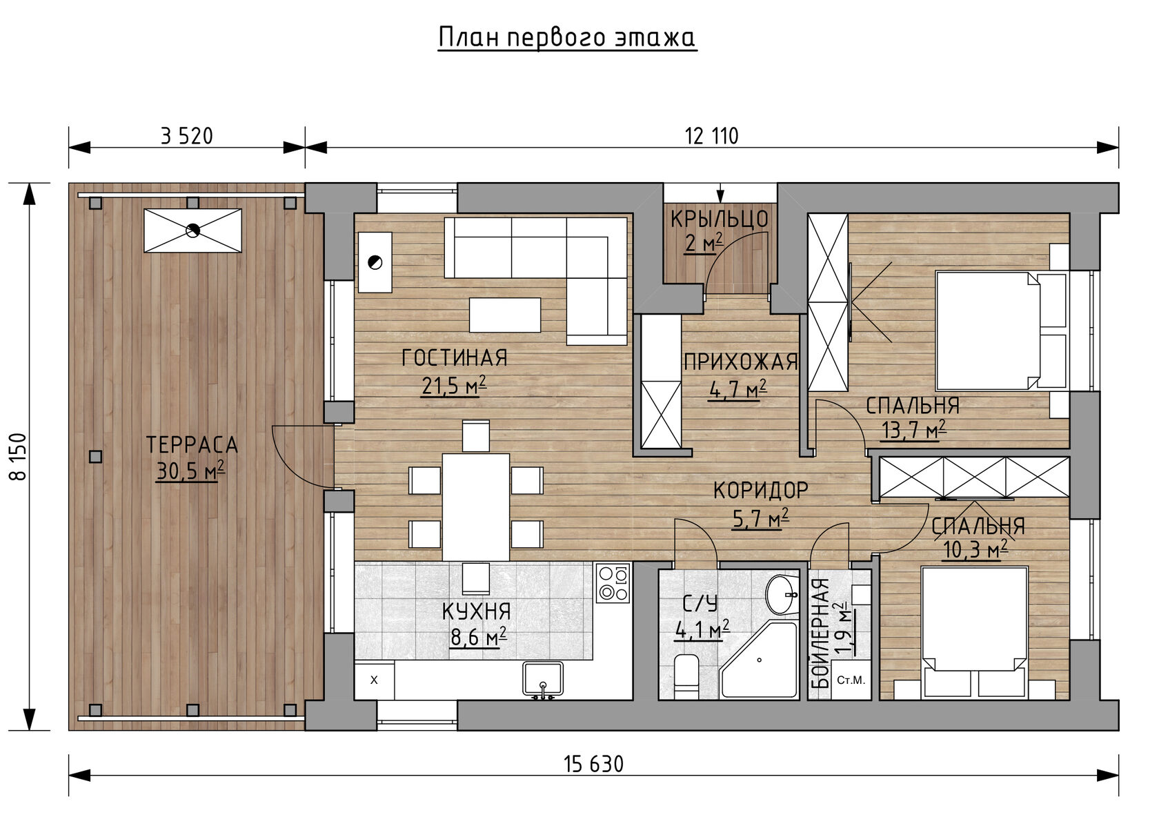 Имеет две просторные спальни, ванная, бойлерная, прихожая, гостиная панорамными окнами и кухня-столовая.