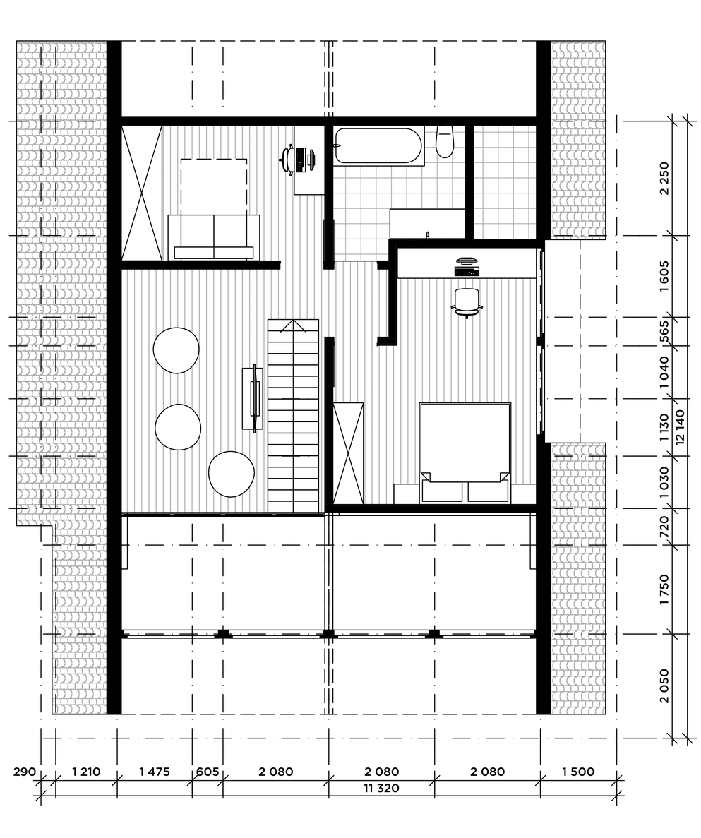 Общая высота дома (от низа обвязочного бруса до верха стропил в коньке)